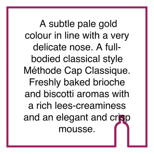 BoschendalOriginal price R 1,314.00 - Original price R 1,314.00Original priceR 1,314.00R 1,314.00 - R 1,314.00Current price R 1,314.00| /Tasting NotesPale gold in colour with a flourish of delicate bubbles, this MCC carries enticing lemon cream and almond Biscotti preceding lovely la...