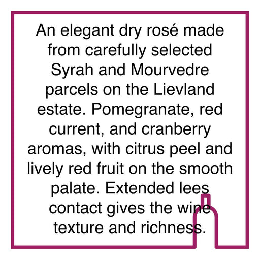 LievlandOriginal price R 1,290.00 - Original price R 1,290.00Original priceR 1,290.00R 1,290.00 - R 1,290.00Current price R 1,290.00| /Tasting NotesAn elegant dry rosé made from carefully selected Syrah and Mourvedre parcels on the Lievland estate. Pomegranate, red current, and c...