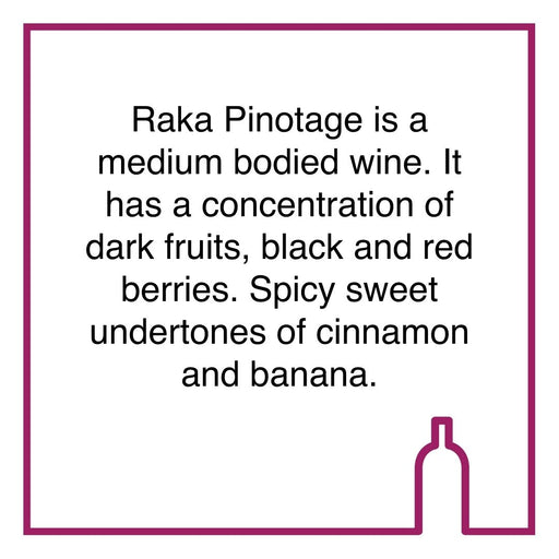 RakaOriginal price R 900.00 - Original price R 900.00Original priceR 900.00R 900.00 - R 900.00Current price R 900.00| /Tasting Notes Raka Pinotage shows earthy and dusty blue fruit with hints of malty toffee adding to the fruity succulence. Hints of pleasant dry s...