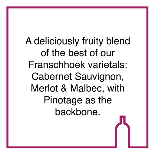 High ConstantiaOriginal price R 1,800.00 - Original price R 1,800.00Original priceR 1,800.00R 1,800.00 - R 1,800.00Current price R 1,800.00| /A deliciously fruity blend of the best of our Franschhoek varietals: Cabernet Sauvignon, Merlot & Malbec with Pinotage as the backbone. All Sil...
